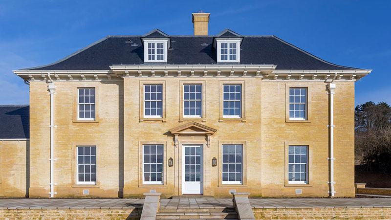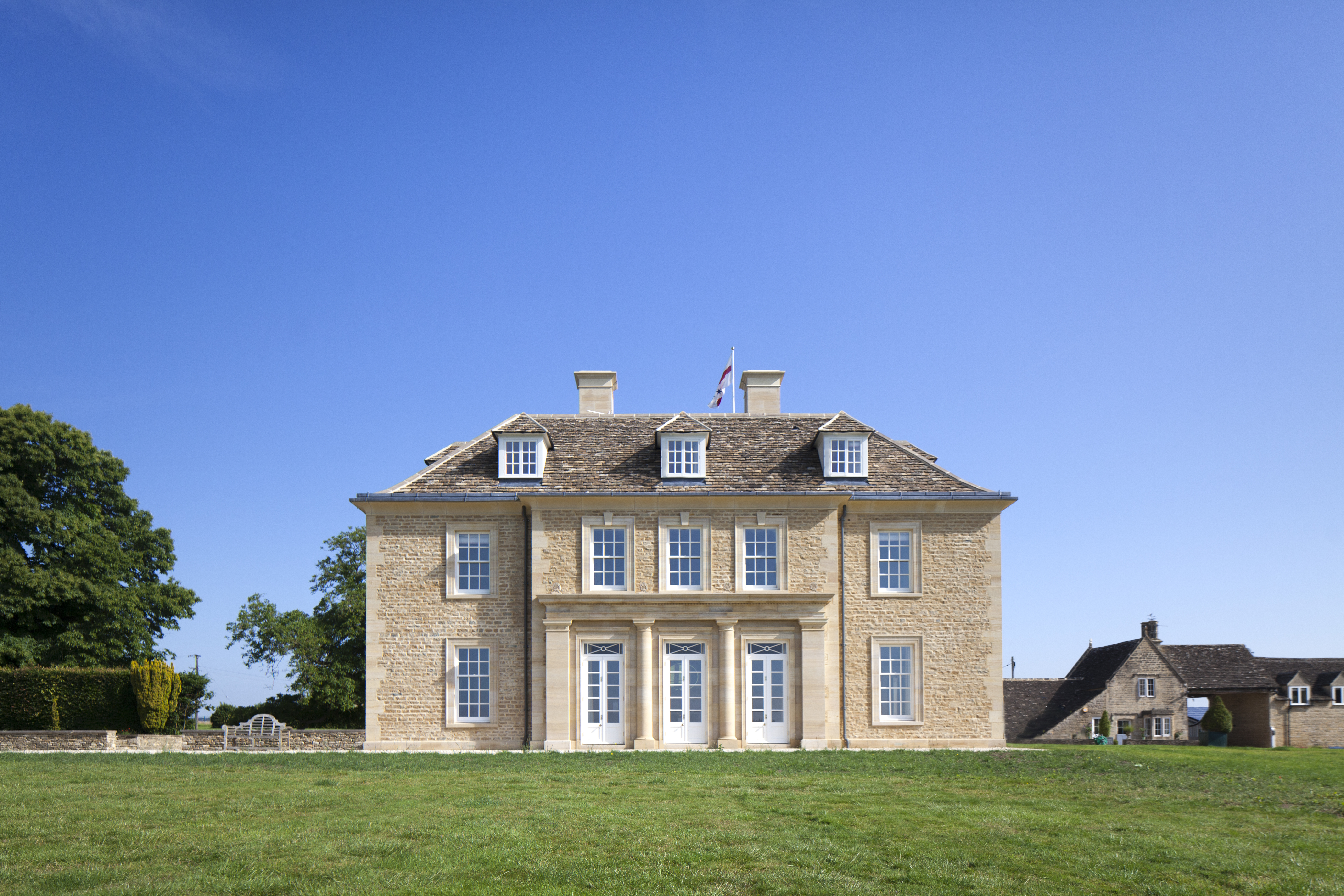 This large classical revival house sits in a glorious hilltop site, overlooking one of the most beautiful parts of the Cotswolds. Ingenious planning strategies enabled us to secure consent for the replacement of what was a very modest house, and we believe this is one of the most significant new country houses built in Gloucestershire over the last century. It was also fortunate that the core of an original range of buildings from the 19th century have been restored and incorporated into the new service yard for the building.