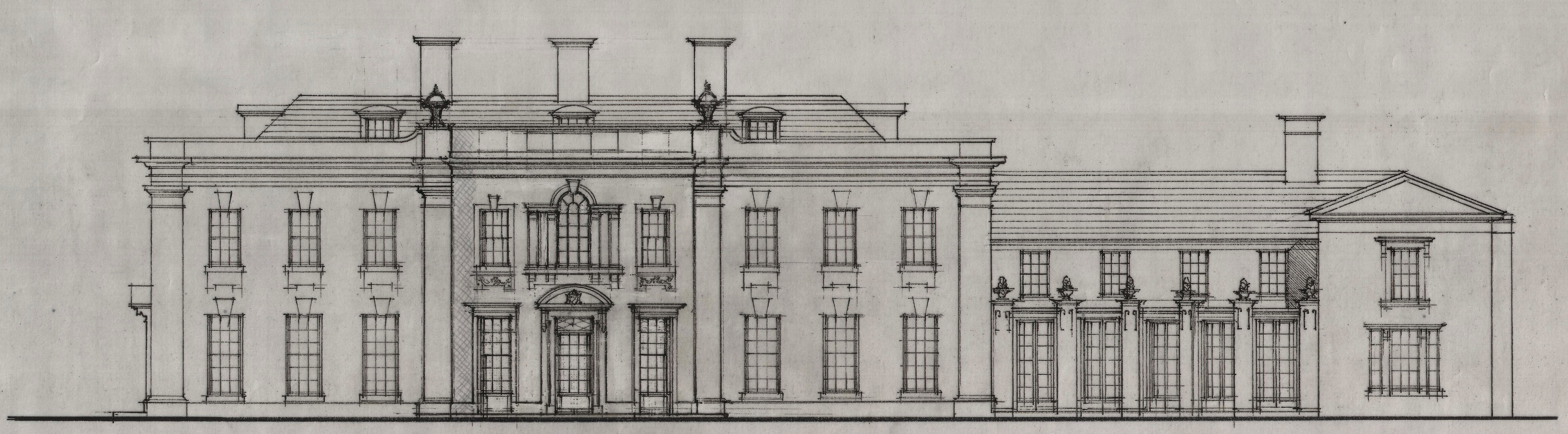 The service wing is connected to the main block to the south via a remarkable curvilinear structure. The language here is of a more sophisticated Neoclassicism, with large, bronzed doors between piers of incised decoration.