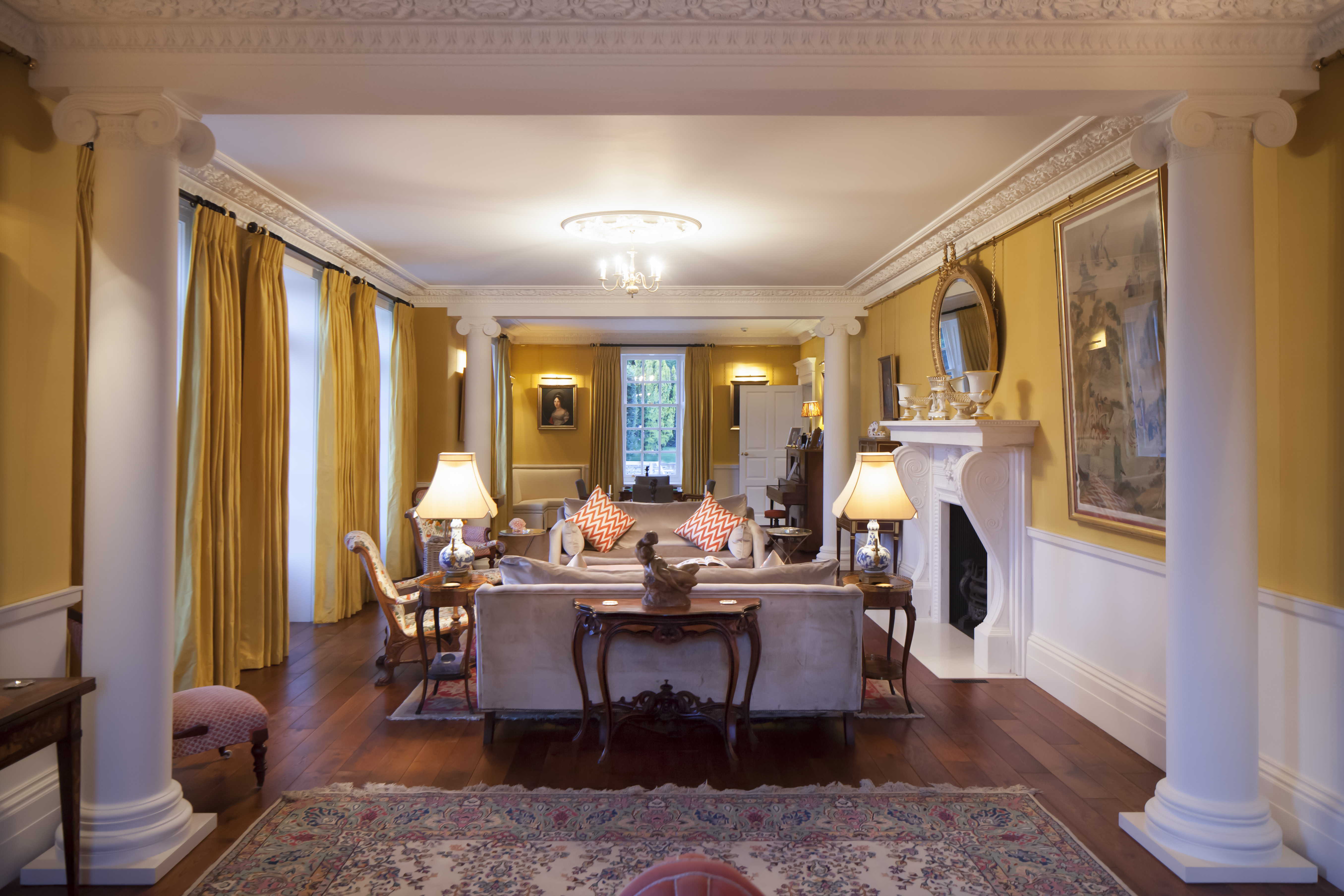Inside, the house is richly detailed. The main fireplaces were designed uniquely by us for the house and complemented by the ornate plasterwork, including very special columns and capitals to the drawing room, which also contains a magnificent statuary marble fireplace. The staircase has finely turned balusters, Corinthian newel posts and ornately carved ends, as well as a grand roof lantern. All the bedrooms on the upper floors have beautiful views over the parkland and beyond.
