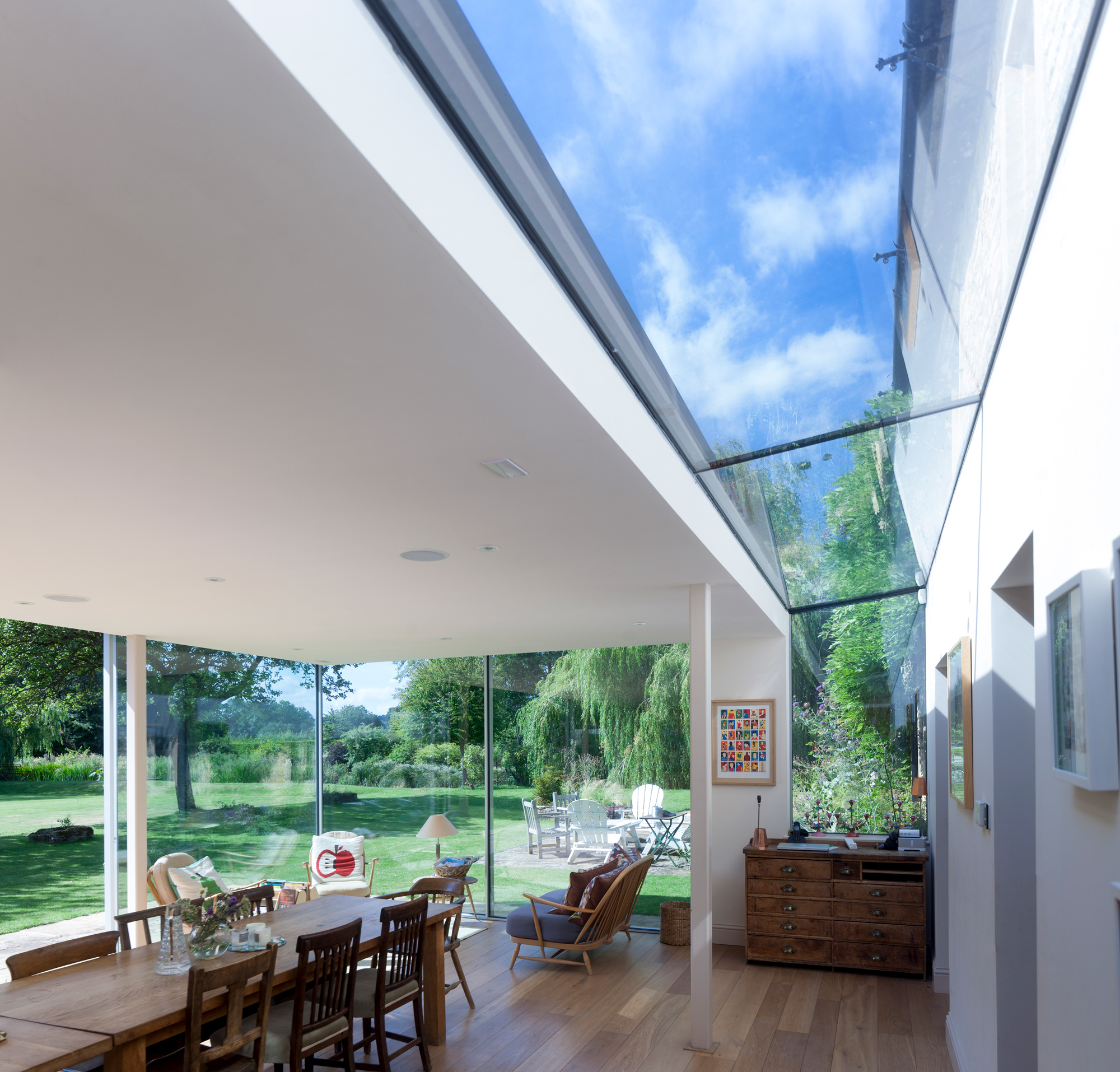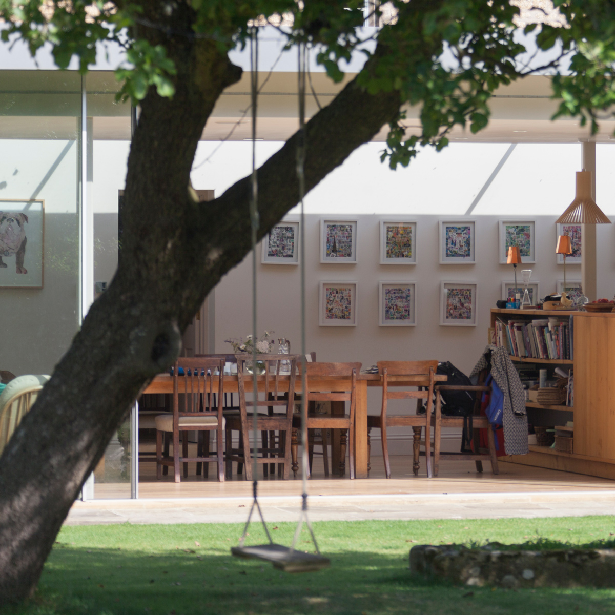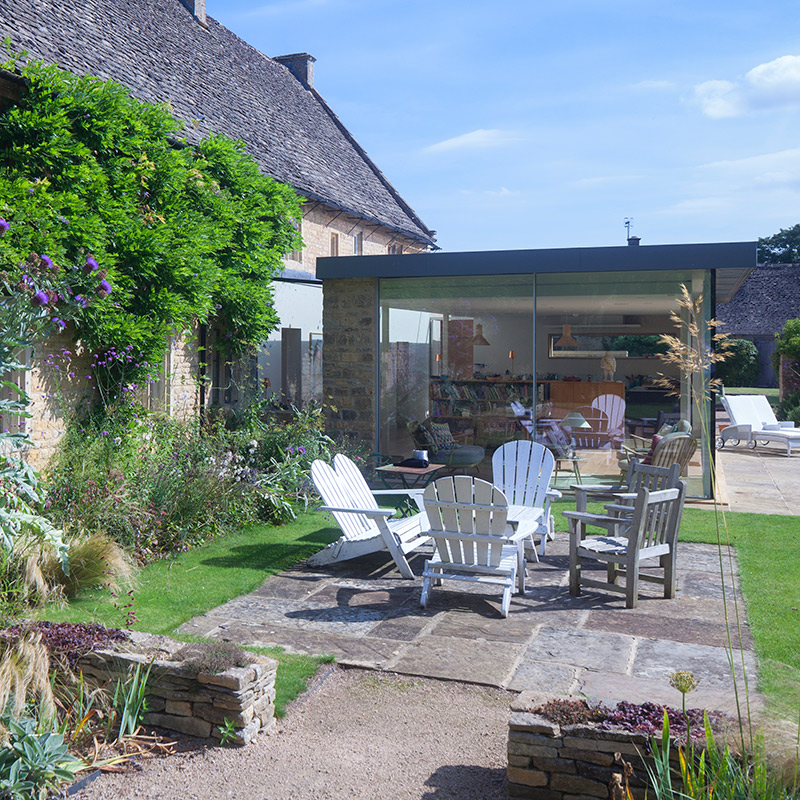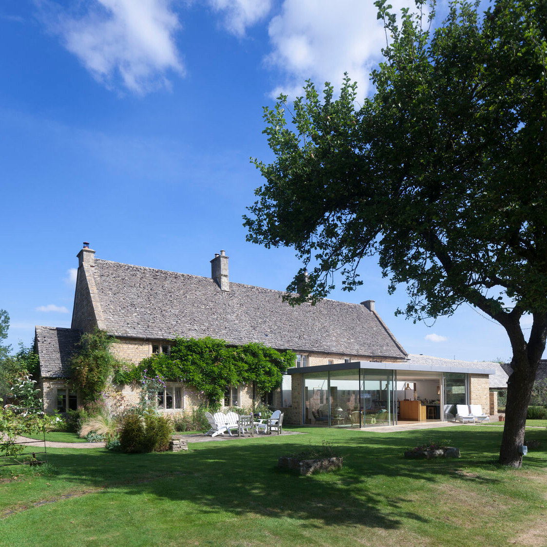 That strip of glass provides the transition between the listed building and the contemporary extension. You briefly step ‘outside’ as you move from the low ceilings, thick walls and dark rooms of the original house in to the light, open and minimal contemporary extension. The final decision was to balance the glass with rubble, Cotswold stone walls to give a respectful nod towards the past whilst still contrasting the two elements.