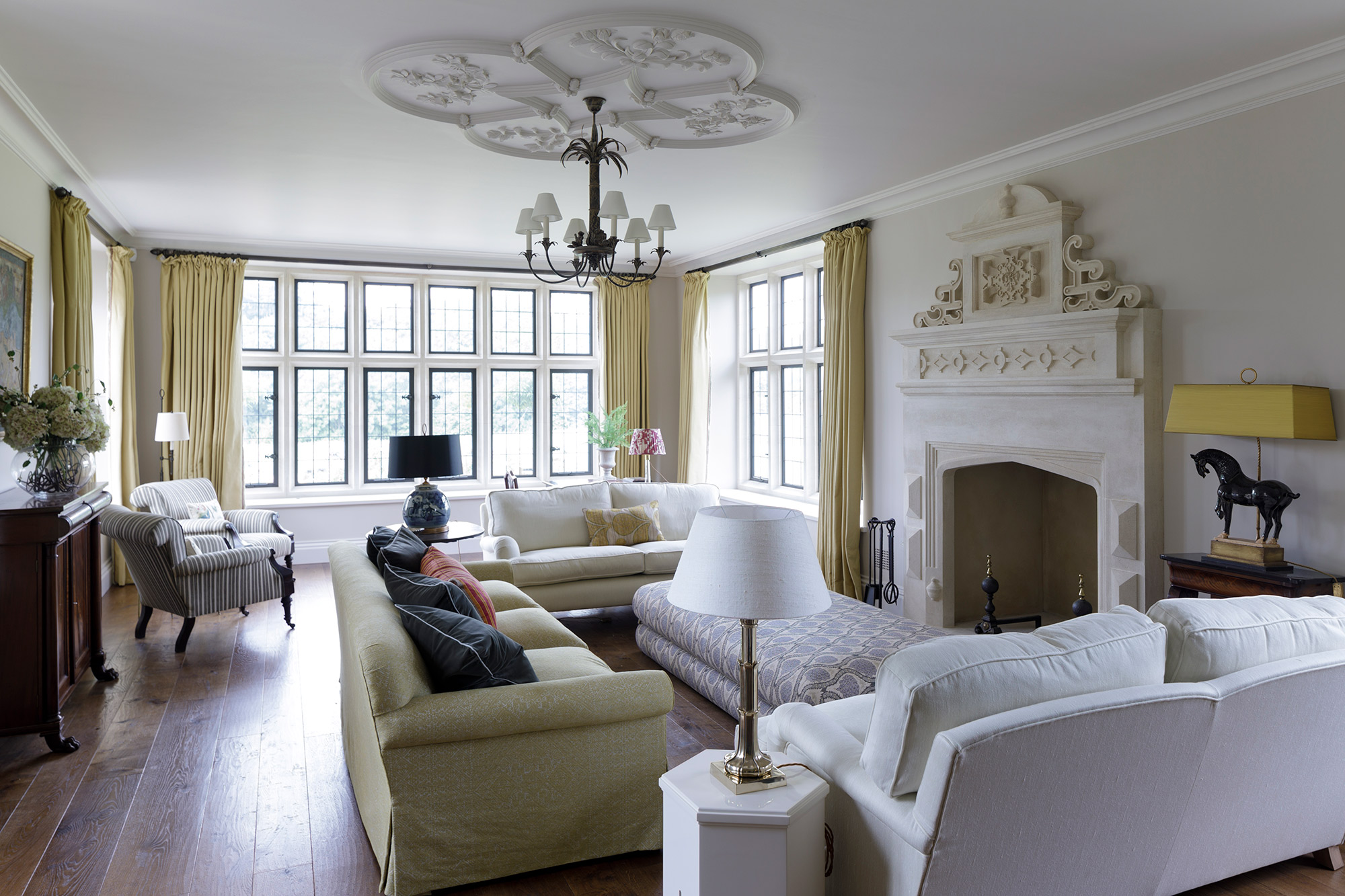 Internally, a flow of rooms is arranged to address the view to the south. The attention to detail continues in the design of elaborate English Renaissance and even more mannerist Jacobean derived stone fireplaces. Here, along with panelling and beautifully designed and crafted plaster ceilings, we feel we created rooms which are an authentic response to a great prevailing tradition, but with novelty and wit.