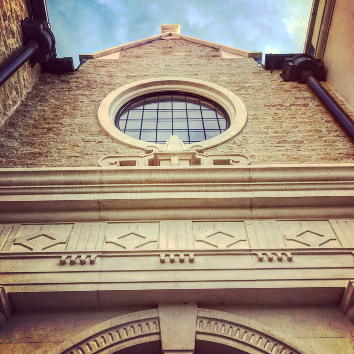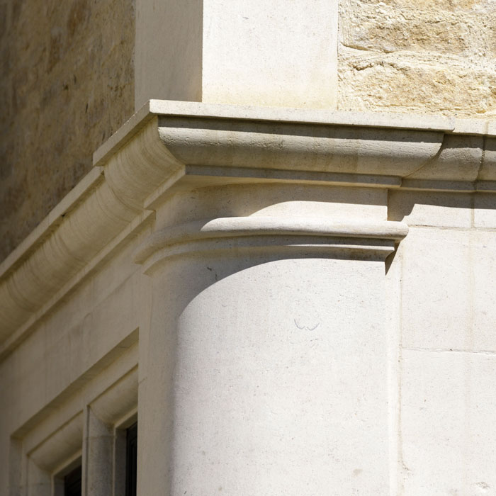 Other more subtle detail of a mannerist variety is seen on such elements as the columned corner mullion on a kitchen window and the weighty externally expressed chimney stack to the kitchen gable. The house is built of pale Guiting stone, both coursed rubble and in its ashlar dressings for detail, with bronzed frame casement windows with leaded cases within the stone mullions.