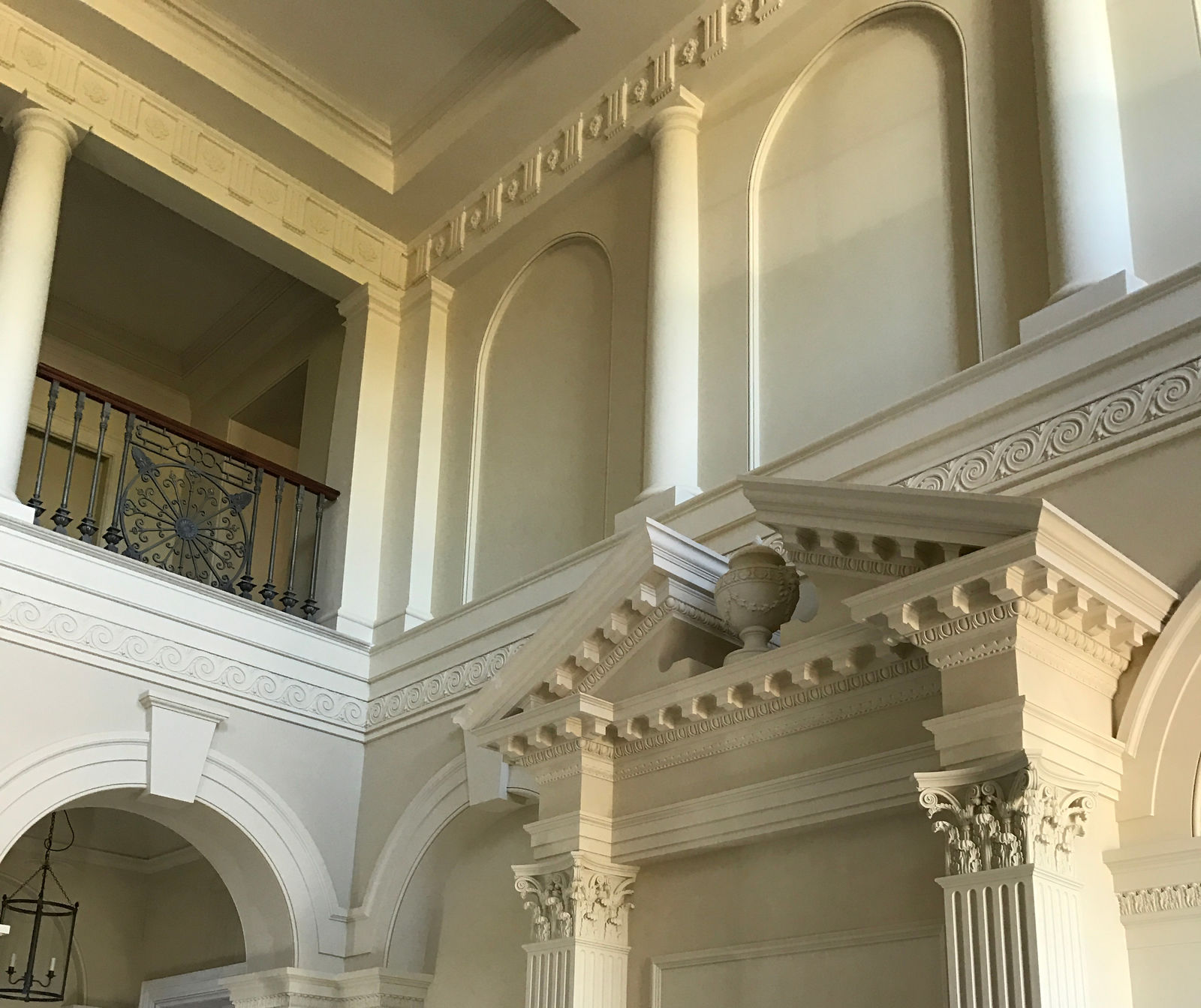Adjacent to the main block of the house is a lower subsidiary service and bedroom range with a severely Neoclassical porch, a counterpoint to the richly Tuscan main door with its archaeologically correct frieze. Here, however, hand carved paterae with iconography uniquely pertinent to the family are a whimsical touch.