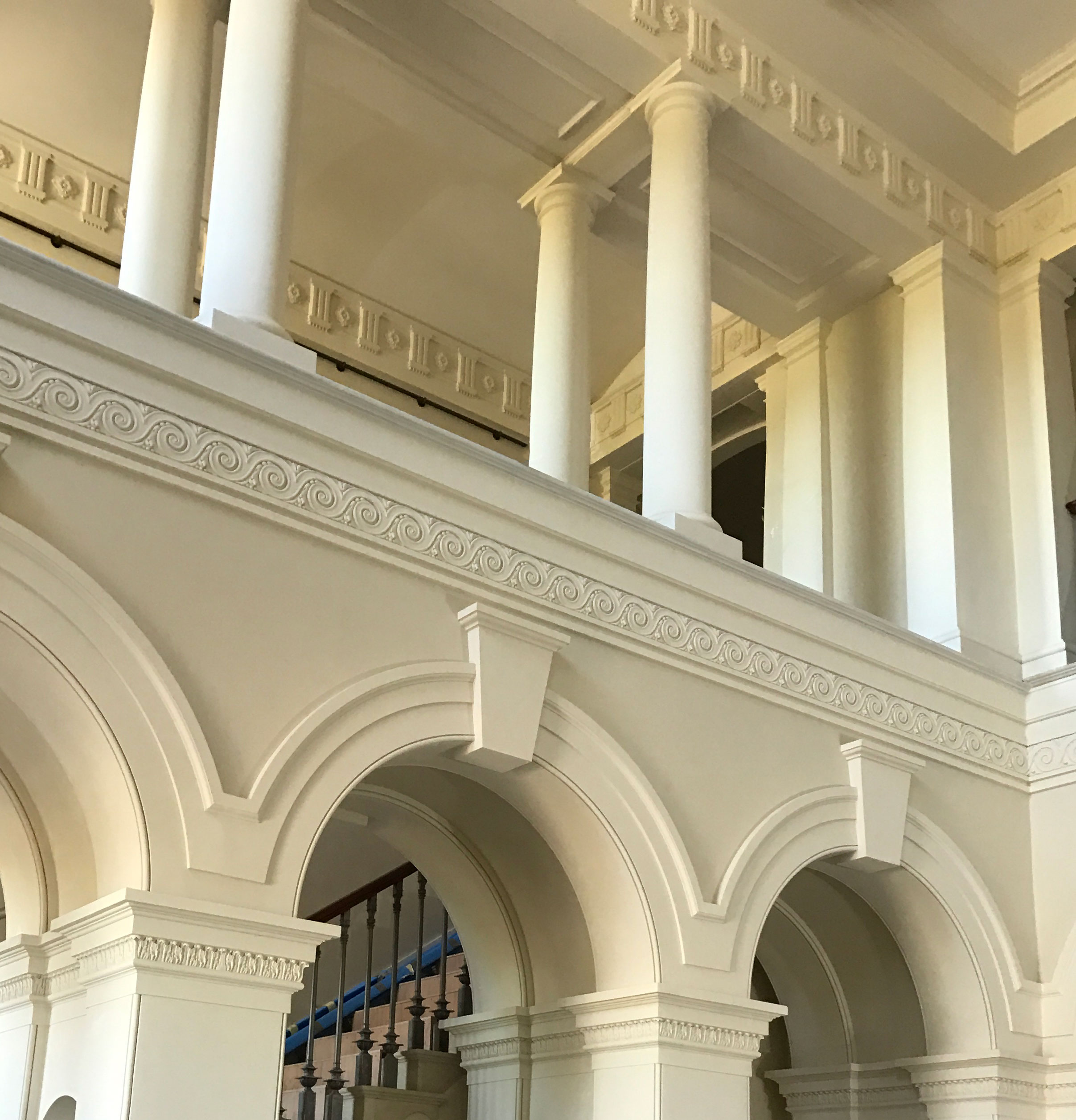 All the elevations are different. The entrance is a nine-bay composition with pediment on simple Tuscan pilasters. The rear elevation has a similar pilastered rhythm but with a gentle segmental bow as its centrepiece, and the side elevation is of 5 bays with a rusticated Gibbsian door surround at its centre.
