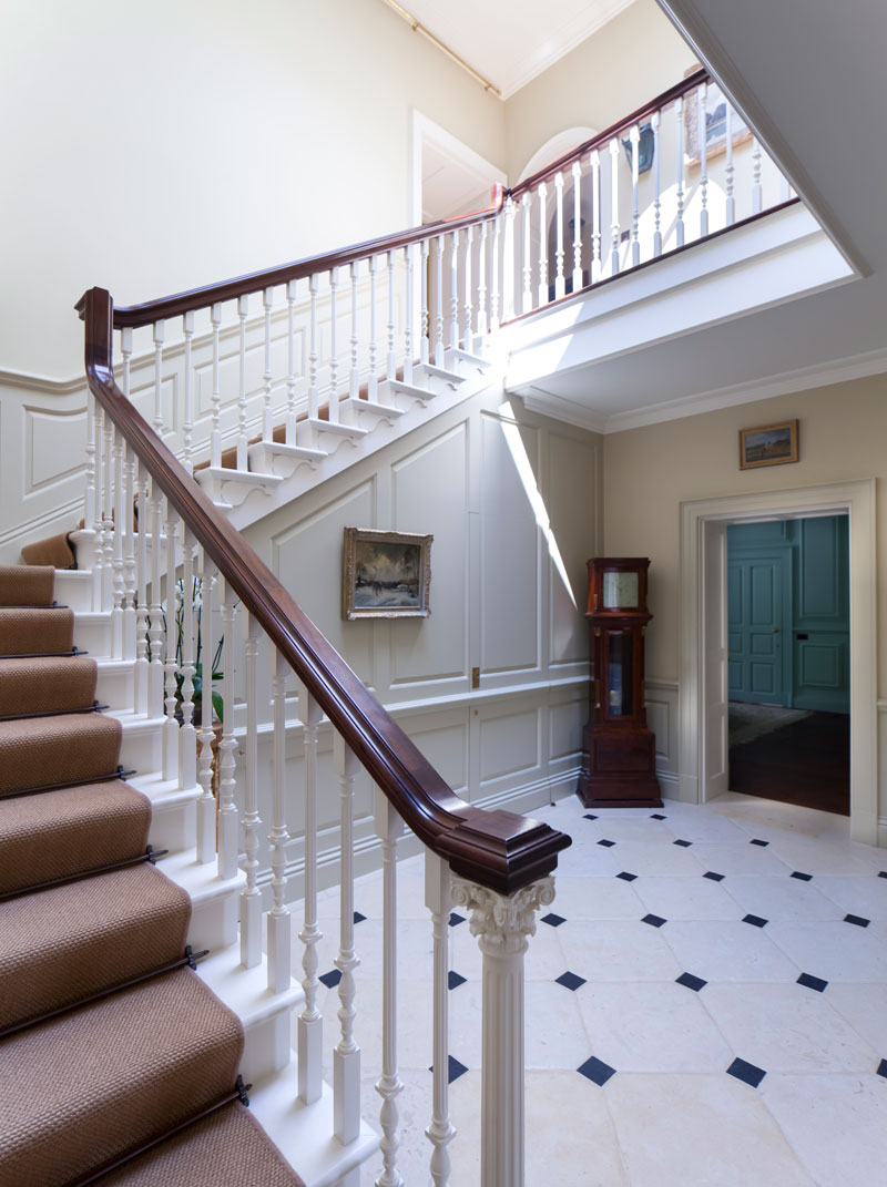 Inside, the house is richly detailed. The main fireplaces were designed uniquely by us for the house and complemented by the ornate plasterwork, including very special columns and capitals to the drawing room, which also contains a magnificent statuary marble fireplace. The staircase has finely turned balusters, Corinthian newel posts and ornately carved ends, as well as a grand roof lantern. All the bedrooms on the upper floors have beautiful views over the parkland and beyond.