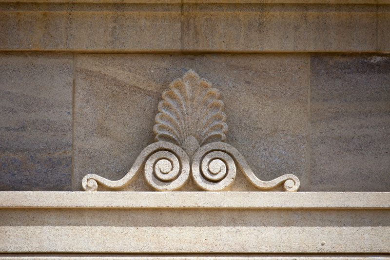 The building is highly and correctly detailed, with a glorious swan necked pedimented door case bearing the family’s coat of arms on the entrance elevation. All the elevations are slightly different, and we have implied the idea of a later historical transformations in some of the architectural forms and decoration, which are in early regency style. This is shown particularly in the kitchen wing, with its Neoclassical proportions, elegant anthemion, and guilloche decoration, and on the garden side with its decorated Tuscan columns and frieze surmounted with sculptural stone acroteria.