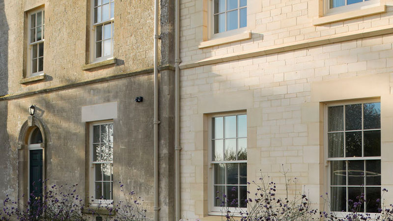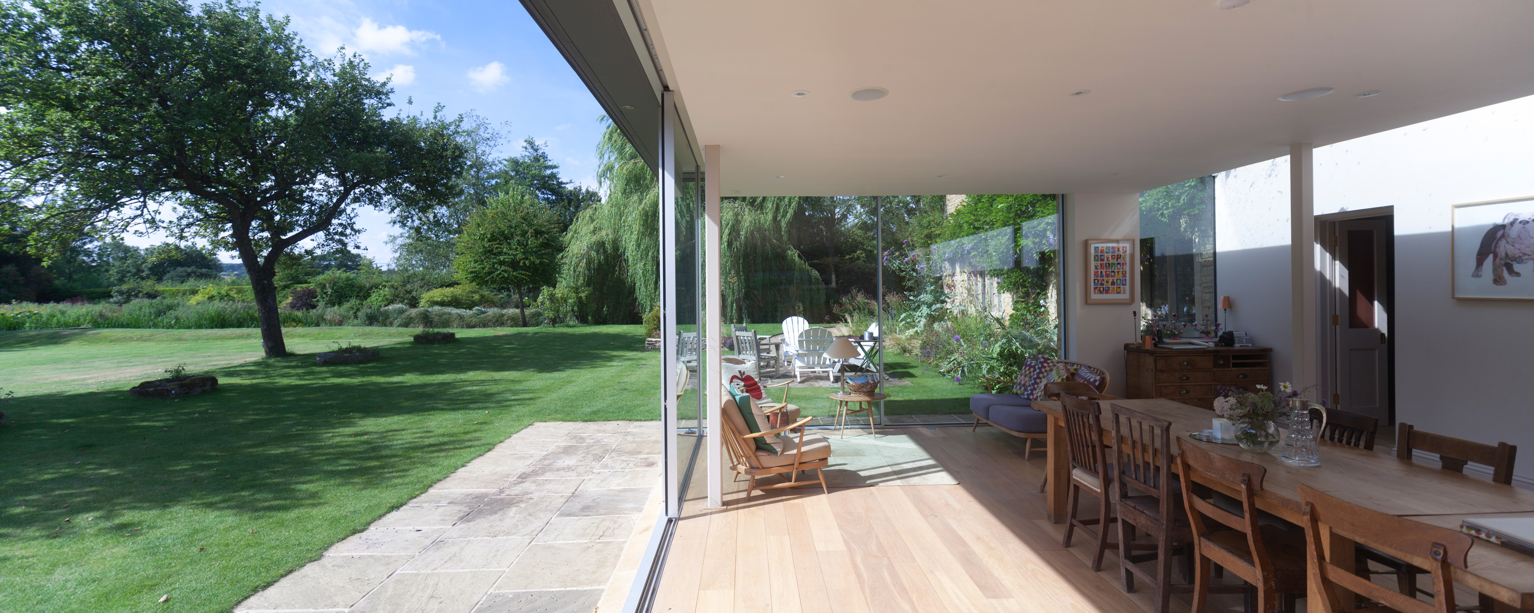 That strip of glass provides the transition between the listed building and the contemporary extension. You briefly step ‘outside’ as you move from the low ceilings, thick walls and dark rooms of the original house in to the light, open and minimal contemporary extension. The final decision was to balance the glass with rubble, Cotswold stone walls to give a respectful nod towards the past whilst still contrasting the two elements.
